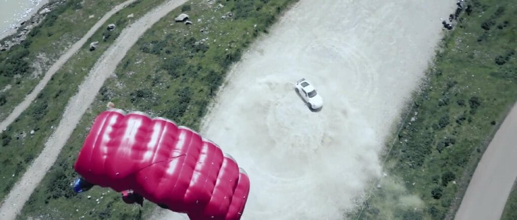 Filming in the Swiss Alps was no small feat. Once we had recced the locations and chosen our winguit athletes, we then started planning the shoot. Safety was the number one priority, both in the air and on the ground. We had filming and medical helicopters, multiple cameras and a large crew to manage, which required detailed preparation. The wingsuit guys made multiple jumps, so we could get the best shots and to make the most of our time, we had two ‘star cars’ with a separate team filming the tracking shots while the aerial unit focused on the wingsuit pilots. The final sequence was filmed as you see it, and the landing of the wingsuit pilot as the car donuts around him was all real!