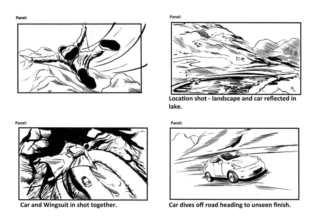 The concept of fusing the heart-stopping spectacle of wingsuit flyers with the precision of the Nissan 370Z Nismo was born, and we delved into meticulous storyboarding sessions. See some of our initial storyboards below: